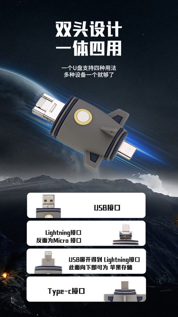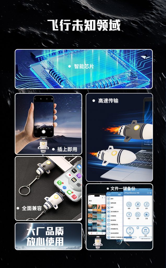 🌌 航天科普展、科技研学活动的绝佳周边!还原火箭升空姿态的软胶造型,自带航天科普属性,定制活动 LOGO 或航天 IP 联名标识,既能作为活动纪念,又能让参与者在日常使用中重温探索宇宙的乐趣。双接口高速传输、多容量可选,存下活动视频、科普资料,让航天精神在数据流转中持续传递。