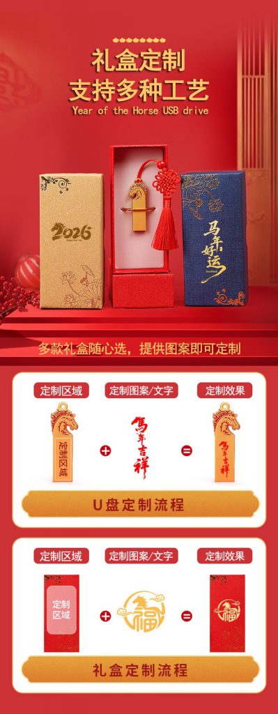 🐎 马年商务礼首选!这款金属马形 U 盘,以浮雕工艺勾勒骏马轮廓,搭配红色中国结挂饰,把国风祥瑞与实用科技直接焊在一起。直插式设计即插即用,告别繁琐插拔,办公传输更高效;1G-512G 全容量覆盖,适配不同存储需求。支持企业 LOGO 定制,年会伴手礼、客户答谢礼安排上,让 “马到成功、一马平川” 的美好寓意与品牌标识深度绑定,每一次数据传输都是一次品牌温度的传递✨