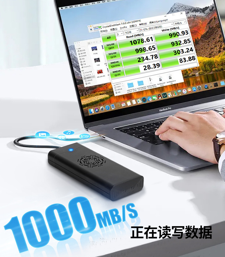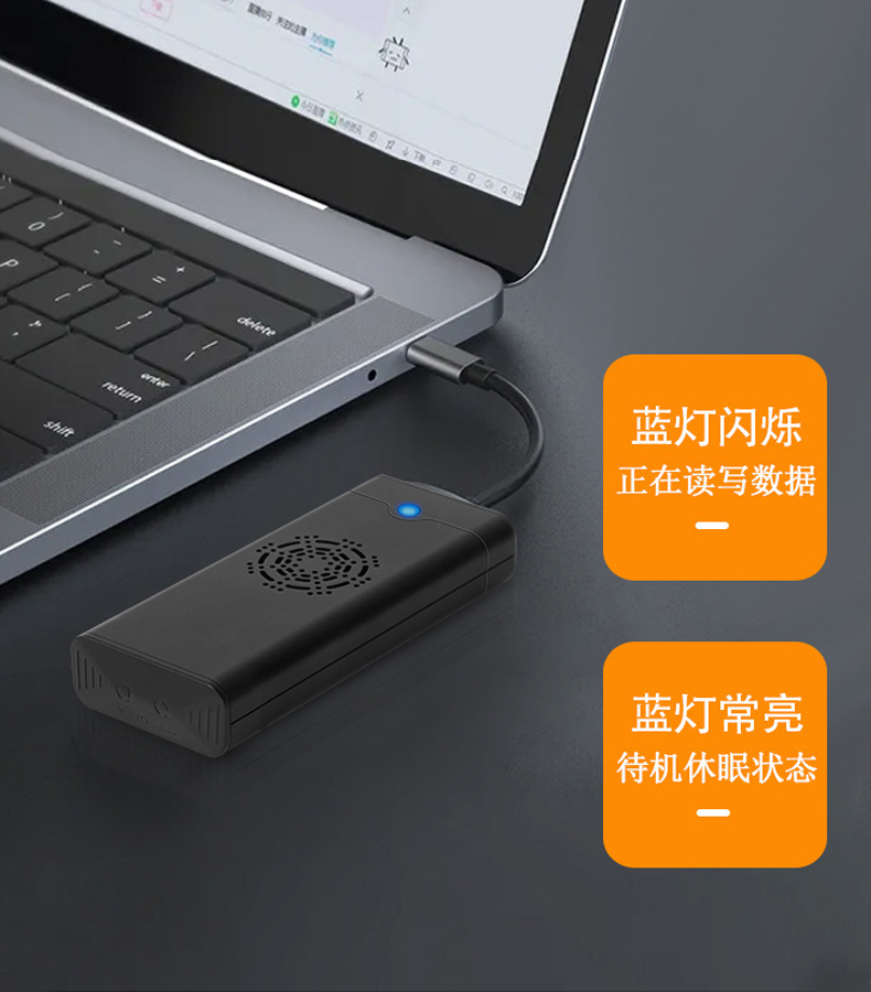 10/20Gbps高速传输铝合金外壳,非一般速度1GB文件实现秒传,采用主控芯片RTL9210B,理论传输速度10Gbps实测读取和写入速度可达1000MB/S左右,铝合金外壳+内置风扇双层散热,利于数据高速传输和存储安全的同时,更好的延长SSD寿命。