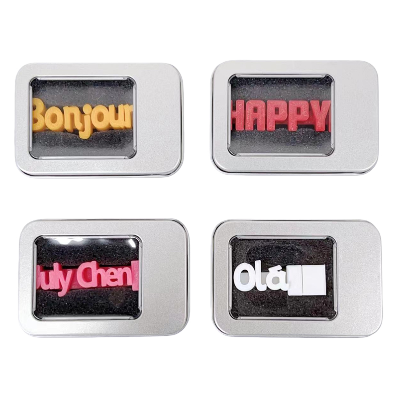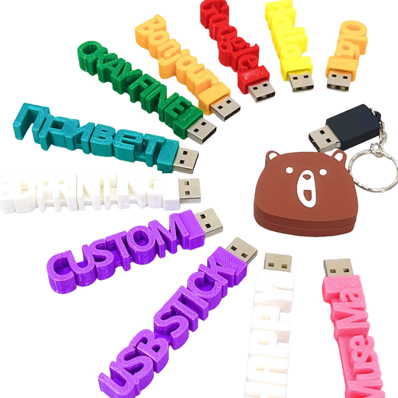 英文字母造型的定制 U 盘, 它们用彩色 3D 立体字母拼出单词(比如 “CUSTOM” 或专属名字),大多自带钥匙扣设计,还有各种图标和小动物造型做装饰,小巧便携的同时,既是实用的存储设备,也能当独特的装饰小物件。